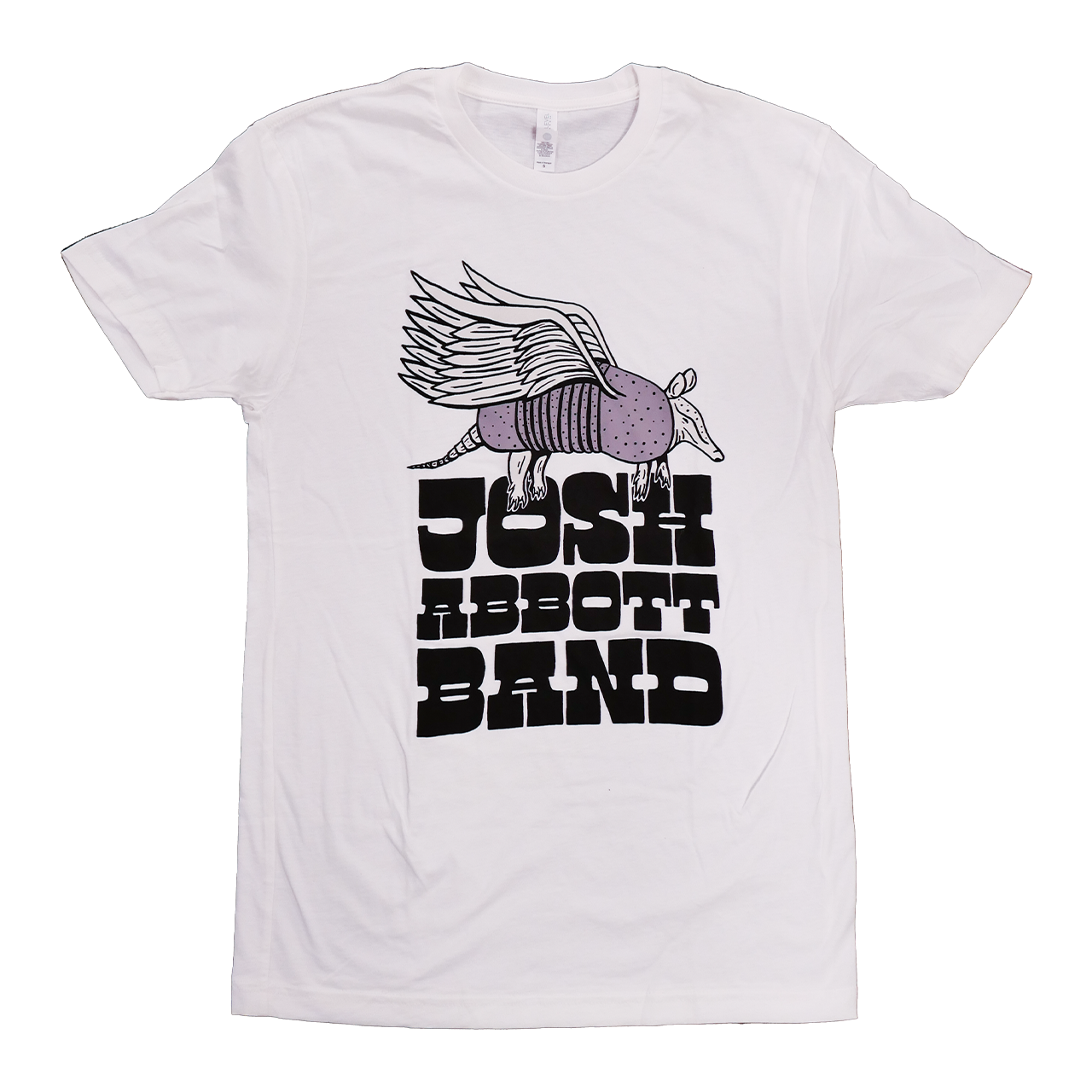 This white Armadillo JAB Tee features a winged-armadillo illustration with text that reads, "Josh Abbott Band".